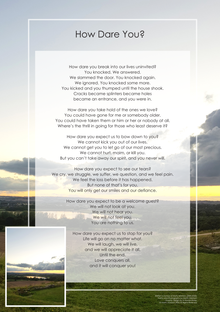 As a sensitive, creative soul, I have been writing songs and poems sporadically for over 30 years. After my son passed away from cancer in May 2022, I felt compelled to use poetry to express my thoughts and feelings. That led to a couple of my poems being published in an “Art After Loss” exhibition, which was launched by Full Circle Funerals.