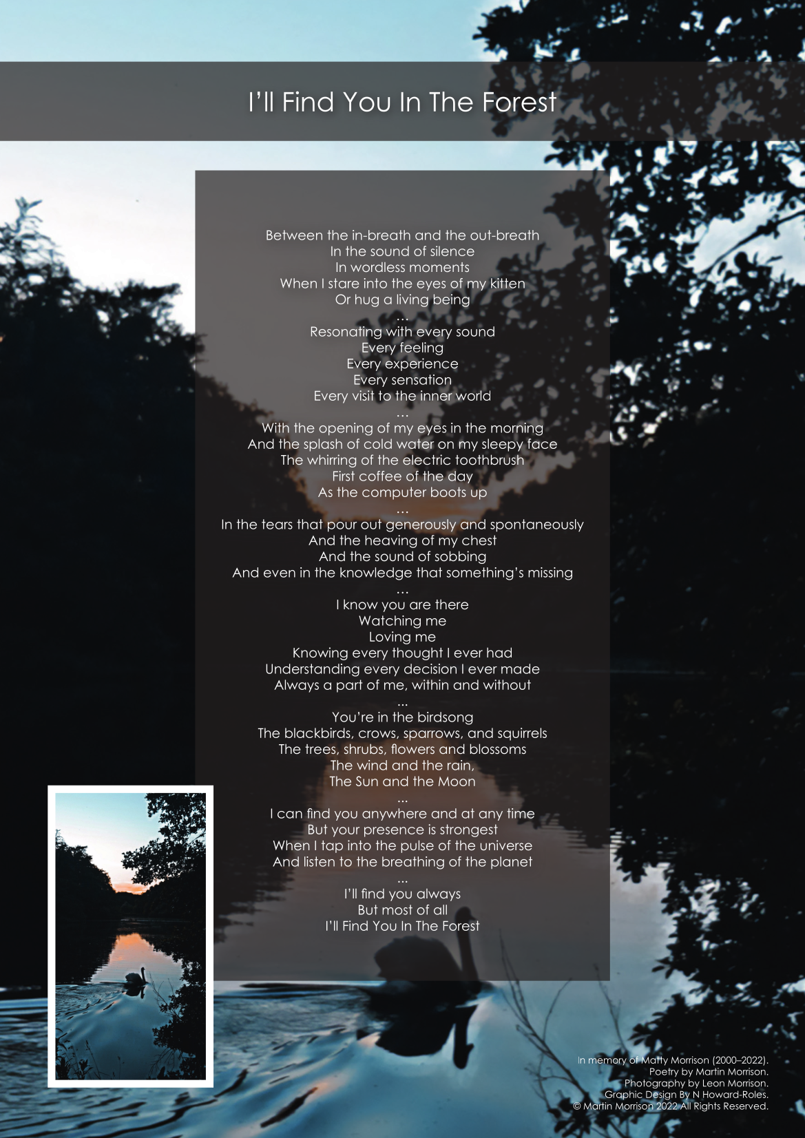 As a sensitive, creative soul, I have been writing songs and poems sporadically for over 30 years. After my son passed away from cancer in May 2022, I felt compelled to use poetry to express my thoughts and feelings. That led to a couple of my poems being published in an “Art After Loss” exhibition, which was launched by Full Circle Funerals.